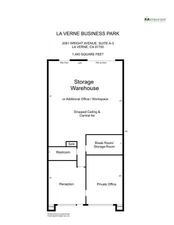 Reception + Private Office + Break Room/ Storage Room + Clean, Private Restroom + Large Storage Warehouse (or add'l office/workspace) + dropped ceiling + Central Air + Rear Roll up Door. *See...
