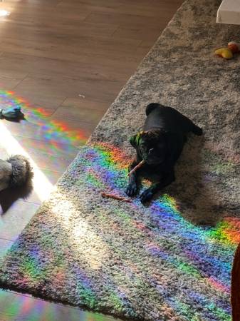 He’s a black, 6 month old pug. He’s very playful, loves other pets, and likes to lounge around mostly. I unfortunately can’t keep him in my apartment because there’s a no pet policy, so I’m hoping to rehome him to a loving family. There is a rehoming fee because he is neutered and has all his shots.
