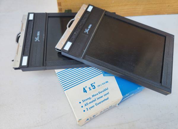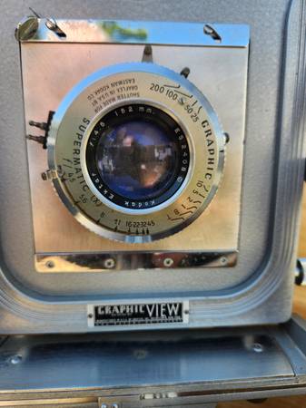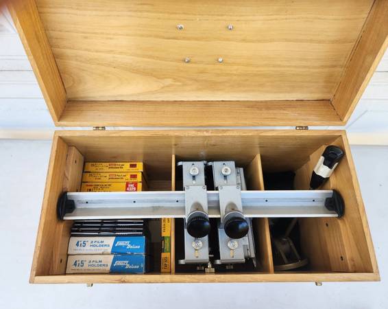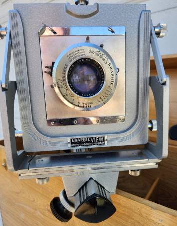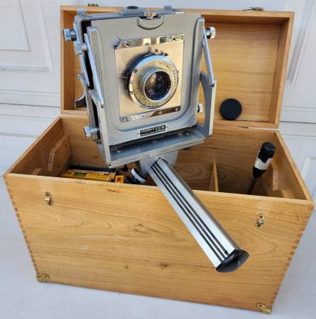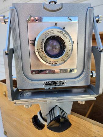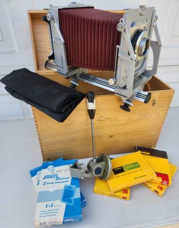 4x5 Graphic View Camera Outfit with extras in great shape in nice wooden case.
