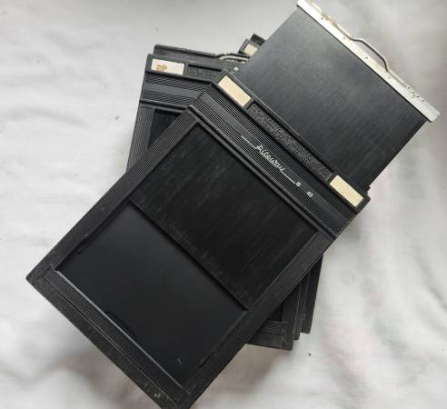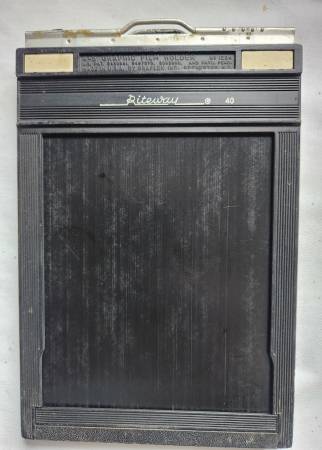 This product is a set of five Riteway 4" x 5" sheet film holders designed for large format cameras by Graflex inc. These cut film holders are compatible with a universal range of camera brands. Perfect for film photography enthusiasts looking to securely hold and transport their 4x5 inch film sheets, these holders are a practical accessory for any large format camera setup. These are previously owned and in reasonable condition.