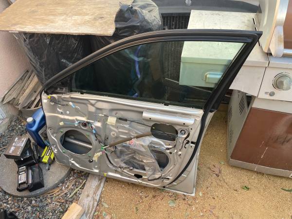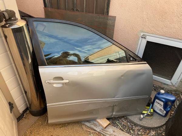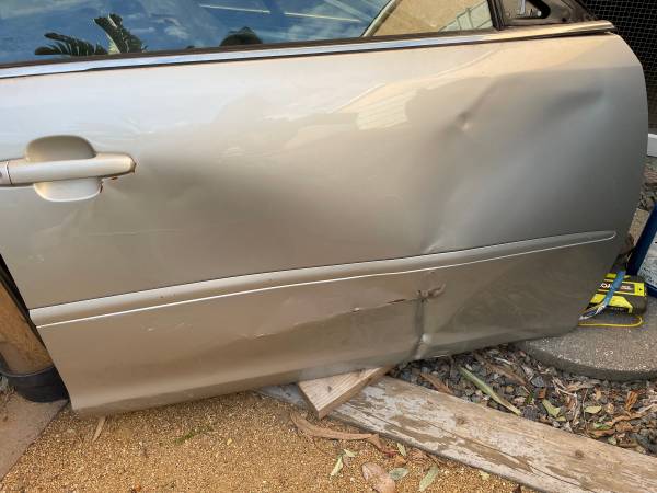 2003 Camry door (damaged) front passenger, door can be fixed. It had no problem shutting and sealing. Besides the door itself all the remaining parts are good like the window glass, electric harness, Door handle, window motor, power lock actuator, weather stripping, trim.