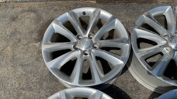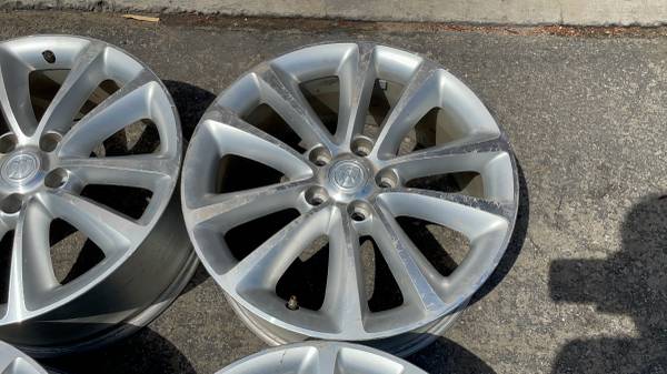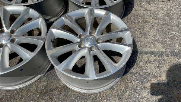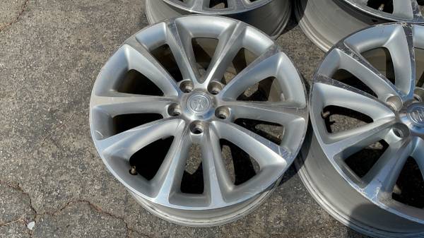 This is a set of four 18x8 inch original factory aluminum wheels from a 2012-2015 Buick Verano. All four rims are in good working condition with a few small scuffs and scratches but without any bends, cracks, or structural damage. The 5 on 115 millimeter lug pattern fits most Buicks as well as many Chevy, Cadillac, and Pontiac cars from the 2000s or newer. The wheels are stamped with the General Motors (GM) logo and have an IS 46 offset. This set is ready to be mounted on a daily driver, commuter, or project vehicle.