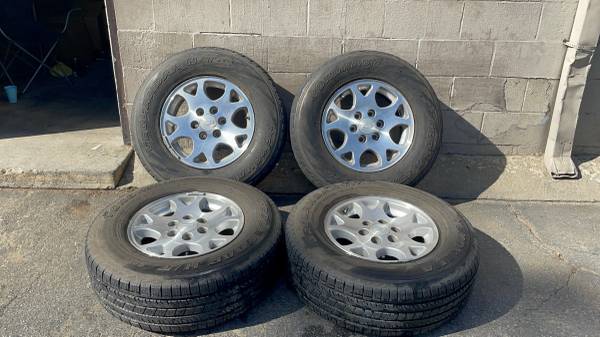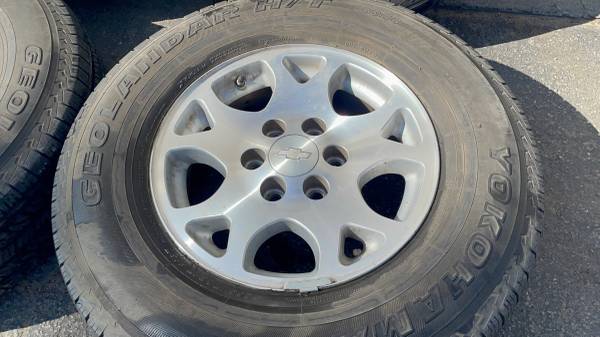 This is a set of four original factory Chevy aluminum wheels, measuring 17 by 7.5 inches, that came off a Tahoe Z71 4x4 SUV. The wheels feature the versatile 6 on 5.5 inch lug pattern, which fits almost any full-size 6-lug Chevrolet or GMC truck or SUV from the 1990s or newer, including Silverado, Sierra, Tahoe, Suburban, Yukon, and Avalanche. All four rims are in good structural condition, having no bends, cracks, or damage anywhere. The tires are old and must be replaced before driving, though they will hold air if you only need the wheels for rollers or burners. Stamped with the GM logo, this structurally sound set is perfect for a direct replacement or upgrade on any compatible GM truck or SUV.