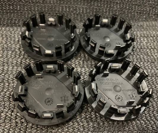• Mopar Dodge OEM Slash Wheel Centercaps Set Charcoal Grey Challenger Charger Durango 6CZ27TRMAA 2.5’in -Phenomenal pre owned condition no damage like new, all rear tabs in tacts -Oem “Slash” style...