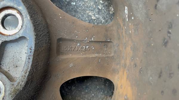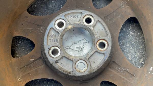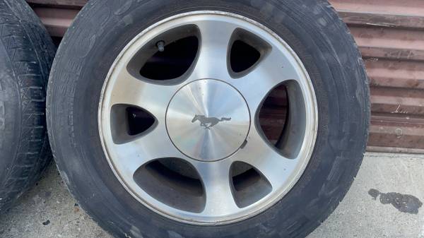 This is a set of four 15x7 inch aluminum wheels and caps from a Ford Mustang car. The lug pattern is 5 on 4.5 inches (114.3mm) which fits many 5 lug vehicles that support this pattern. The rims and caps are in good condition no bends or cracks. The tires are old and should be changed.