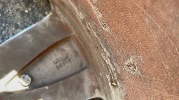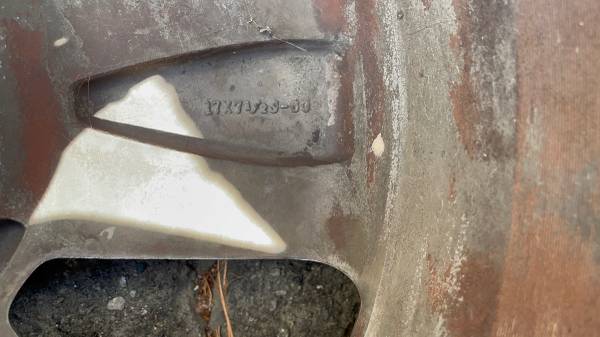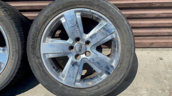 This is a set of four 17x7.5 inch original Ford factory chrome-clad aluminum wheels with a +60mm offset, from a 2006 Lincoln LS. The rims are in good condition with no bends, cracks, or major damage, though one center cap is missing. The 5 on 108 millimeter lug pattern fits many Ford vehicles, including the Ford Focus and the Transit Connect minivan. The tires are bad and need to be changed right away, and the wheels are stamped "Made in the USA." This set is perfect for a work vehicle, daily driver, or commuter.