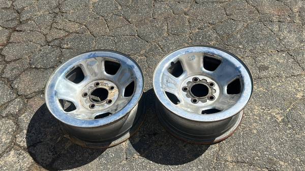 This is a pair of two original 15-inch chrome steel wheels, believed to be 15x7 inches, that came off a Chevy Astro van. These durable wheels feature the common 5 on 5 inch lug pattern. They are compatible with a wide range of GM vehicles, including the GMC Safari, Savannah, and Chevy Express vans, as well as most 5-lug, full-size Chevy and GMC trucks from 1971 through 1999 (C10, Silverado, Sierra, Suburban, Tahoe, and Yukon). Both rims are in good working condition, showing no bends, cracks, or major damage, though they could benefit from some cleaning. You can purchase these wheels individually for $60 each or take the matching pair for a total price of $100
