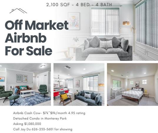 For sale by owner Off-market gem in Monterey Park! ✅ 4B4B, 3-car garage, 2,100 sqft detached condo in a gated community ✅ Airbnb performer — monthly rent is 2x higher than long-term lease Can be...