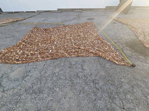 Assorted camouflage netting panels in desert/tan colors. Multiple pieces in varying sizes totaling about 1000 square feet. Contained in 3 bags Uses include: -Shade structures -Festival or event...
