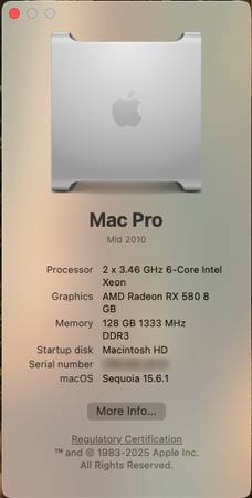 FULLY LOADED mid-2010 MacPro 5,1 for sale. This thing is still a monster. It’s running Sequoia 15.6.1 under OpenCore Legacy Patcher 2.4.1 (all USB ports functional):