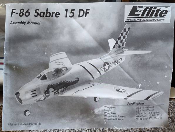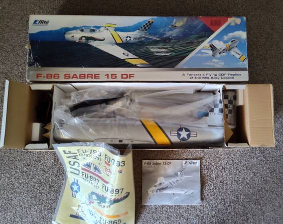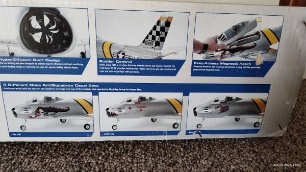E-Flight F-86. This is not the small UMX version. Wing span is 35" fuselage length is 33" Complete kit(includes fan unit,servos, ESC. Why buy "Foam" when you can buy built-up! Fuselage is fiberglass, wings are built up wood covered with film. Long out of production. Sold for $230 back in the day. Have seen others for double the asking price. Requires a 4 channel radio. Price is firm. Pick up is in the city of Montebello You read this..it's available. Will remove when sold.