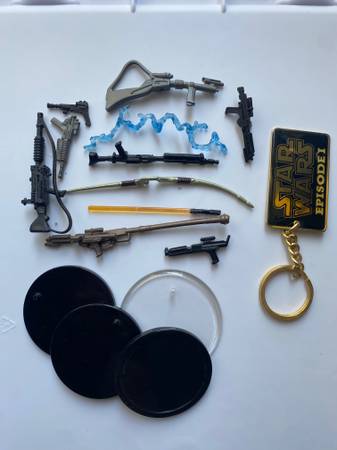 Lot of weapons accessories from Star Wars POTF. Includes 4 figure stands and a 1999 Episode 1 keychain. Also comes with 6 cardbacks. Animal free, smoke free home. CASH ONLY