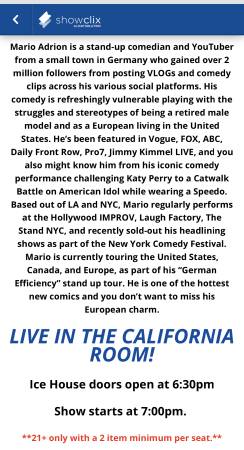 Saturday, November 22, 2025 show at 7pm. 6 tickets seated together at Ice House comedy club table booth. Family can no longer attend the event. Serious inquiries only - willing to negotiate on price...