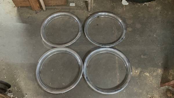 This is a set of four 15-inch chrome trim rings that came off an old classic car. These rings are made of plastic with a chrome finish, unlike original steel ones, but they are all in good working condition. They have steel clips to securely hold them to the lip of the wheel and have no significant scratches, dings, or cracks. After a quick cleaning, they would look great on any project or classic vehicle. These rings are perfect for any 15-inch stock steel wheel on both classic and modern cars or trucks.