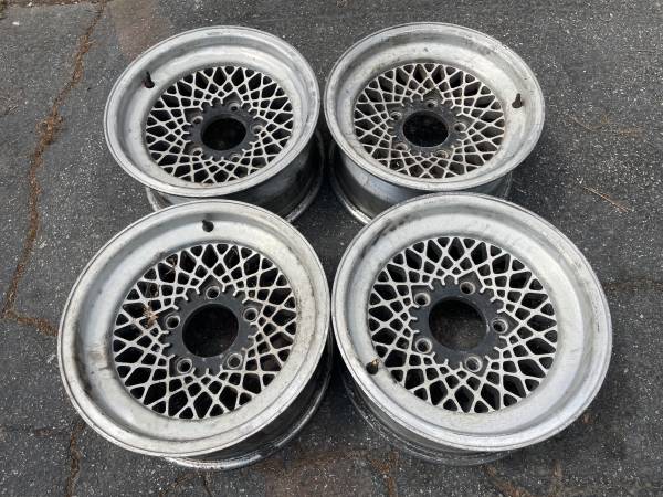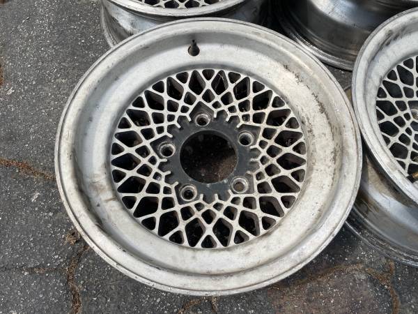This is a set of four American racing aluminum mesh style rims that came off a classic Ford F150. The lug pattern is 5 on 5.5 inches, and they have a large center hole. They will fit on Dodge and Ford trucks as well as Bronco and Ramcharger. Also they will fit CJ5 and CJ7 jeeps, International scout or trucks. They will also fit on Suzuki and Tracker 4x4 and any other vehicle that has this lug pattern and fits 15 inch rims.
