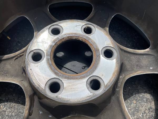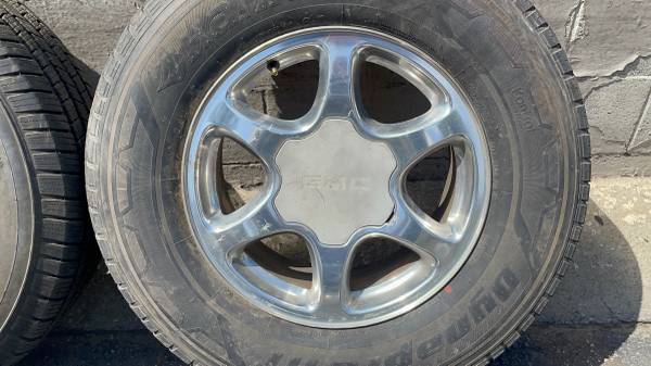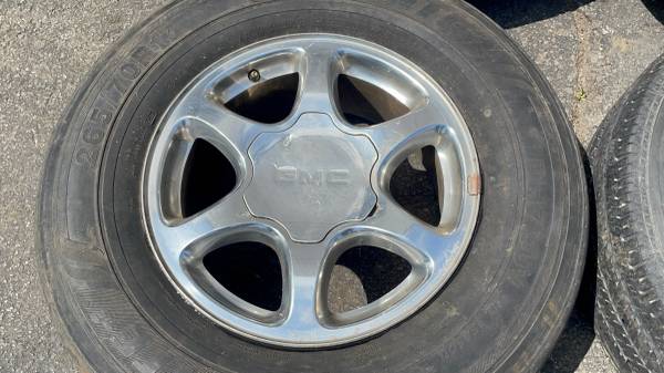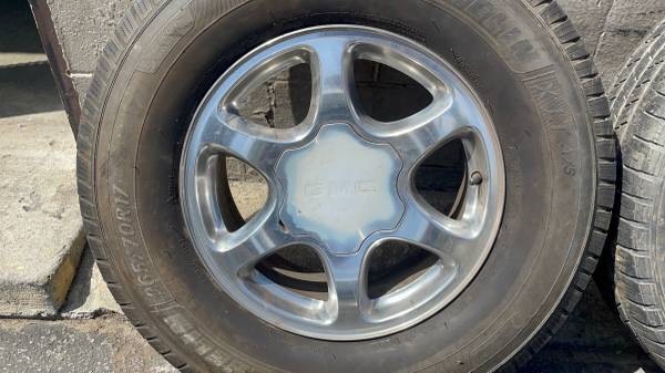 This is a set of four original 17 -inch rims and center caps from a GMC Sierra or Yukon. The lug pattern is 6 on 5.5 inches which fits on any full -size six -lug Chevy truck from the 90s up including OBS trucks, Silverado, Tahoe, Suburban, Avalanche. They also fit Express Vans, Savannah Vans, Sierra Vans, and a few others as well. The rims are all in good condition They've got some little scratches, and the hubcaps are a little bit faded, but there's no bends or cracks No damage on any of them. The tires are not good they hold air if you need rollers. Perfect for any daily driver or work truck.