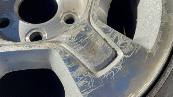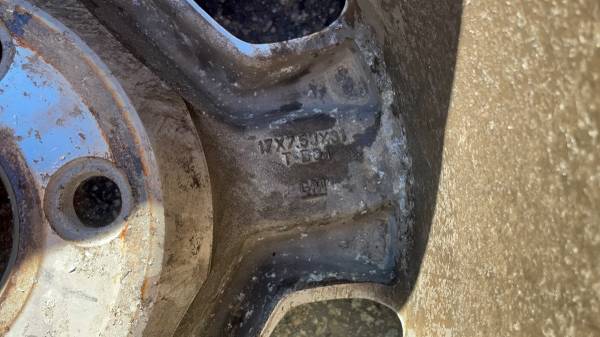 This is a set of four original factory aluminum wheels, measuring 17 by 7.5 inches, that came off a Chevy Silverado, Avalanche, Tahoe, or Suburban. The wheels feature the versatile 6 on 5.5 inch lug pattern, which is the correct fitment for most 6-lug GM trucks and SUVs from the 1990s onward, including the GMC Sierra and Yukon. All four rims are in good structural condition, having no bends, cracks, or major curb rash, but the clear coat is failing, causing small cosmetic lines. You could paint or refinish them to look new, or use them as-is on any driver or work truck. The tires are old with an old DOT date and must be replaced immediately, but they do currently hold air for use as rollers.