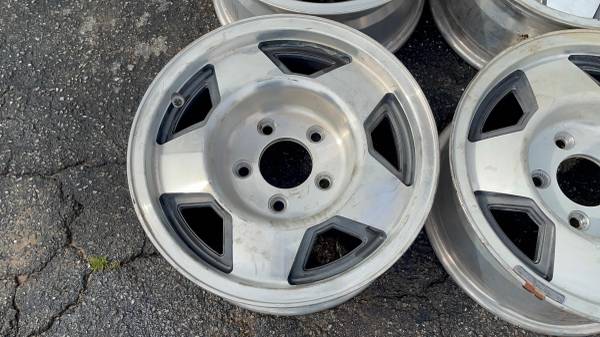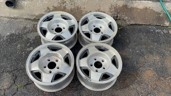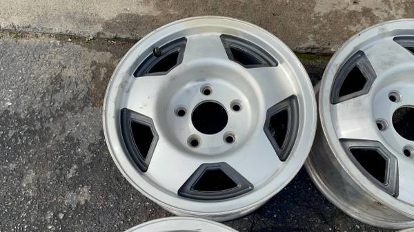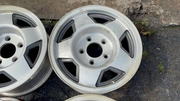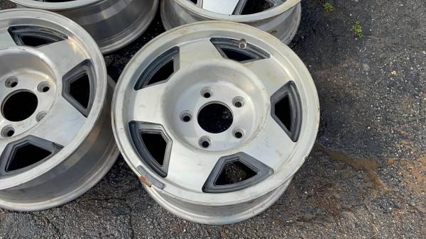 This is a set of four 15x7 inch original aluminum factory wheels from an OBS era GMC Sierra or Chevy Silverado pickup truck. These rims would have been factory on an 88 to 91, but they will actually fit any full size 5 lug Chevrolet or GMC from 1971 through 1999; this includes square body Chevys and also Cheyenne Silverado. They'll fit on Tahoe and Yukon as well as Suburban and a lot of vans from this era. The G10, the G20, the Astro, Savannah, the Safari etc. All four rims are in very good condition, no bend, no cracks, no major curb rash. Perfect for any work truck, daily driver, commuter or project etc.