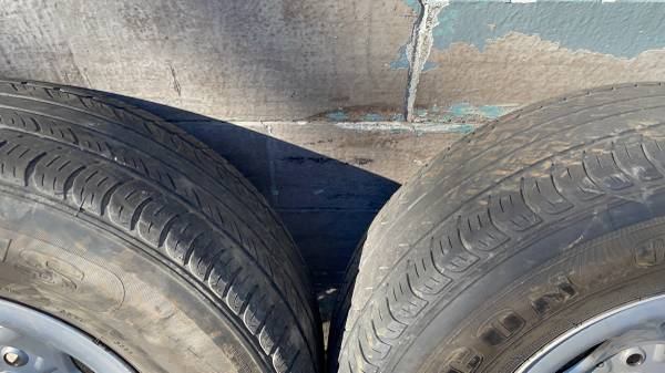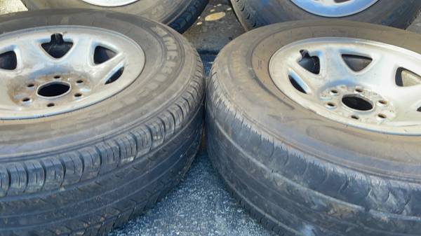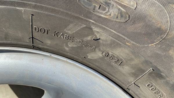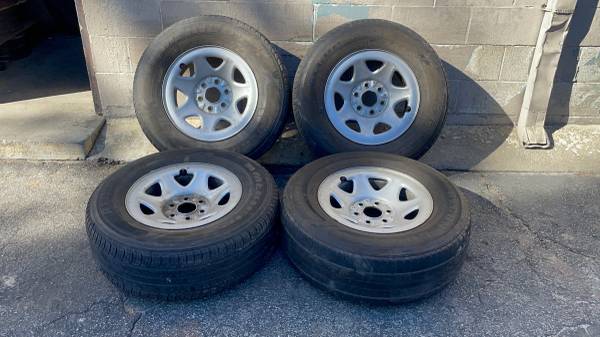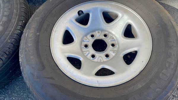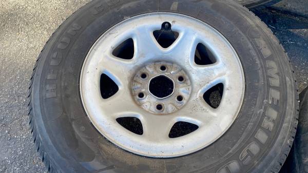 This is a set of four original factory stock steel wheels, measuring 17 by 8 inches, that came from a Chevy Silverado, Tahoe, or Suburban. The wheels feature the versatile 6 on 5.5 inch lug pattern, which is the correct fitment for most 6-lug GM trucks, SUVs, and vans, including the GMC Sierra, Yukon, Express, and Savannah models. All four rims are in good working condition, having no bends, cracks, or major damage, though they show a few small scratches. The tires have a 2021 DOT date and must be replaced right away, but they may be used very temporarily or as rollers. This set is perfect for any daily driver, commuter, or work vehicle needing reliable steel rims.