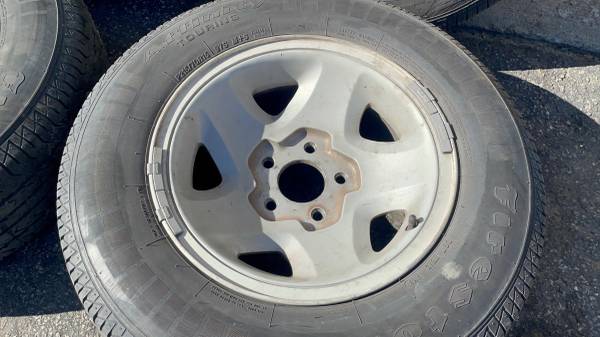 This is a set of four original factory GM steel wheels, measuring 15 by 7 inches, that would be an excellent, solid choice for a driver or utility vehicle. The wheels feature the classic 5 on 4.75 inch lug pattern, which is the correct fitment for most classic Chevrolet and GMC cars and light trucks. All four rims are in good working condition, having no bends, cracks, or damage anywhere, making them structurally sound. The rims are a little dirty but could be easily cleaned up and would look good for any daily driver, work truck, or commuter vehicle. All four tires are very old and must be replaced immediately, but the rims are reliable and ready for new rubber.