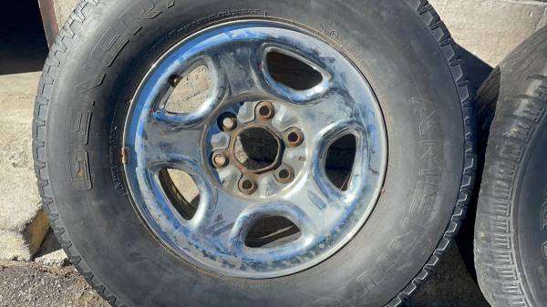 This is a set of four original factory chrome wheels, 16 inches in diameter, that came from a 1999 through 2005 Chevy Silverado or GMC Sierra pickup truck. The wheels feature the versatile 6 on 5.5 inch lug pattern, which is the correct fitment for most full-size 6-lug Chevy and GMC trucks and vans from the 1990s onward. This pattern fits the Silverado, Tahoe, Suburban, Express Van, Astrovan, Sierra, Yukon, and Safari. All four rims are in good working condition, having no bends, cracks, or major curb rash, though they are a little dirty. The tires are very old and must be replaced immediately before driving anywhere, but the structurally sound rims are perfect for any daily driver, work truck, or replacement set.