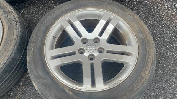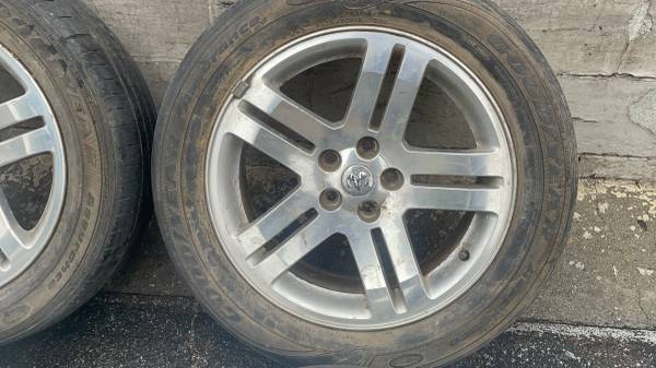 This is a set of four original factory aluminum wheels, measuring 18 by 7.5 inches, that came from a Dodge Charger or Challenger (or the Dodge Magnum/Chrysler 300). The wheels feature the 5 on 115 millimeter lug pattern, which is the correct fitment for many Mopar vehicles, along with certain Chevy and Toyota models. All four rims are in good structural condition, having no bends or cracks, although the paint is peeling and they would benefit from a refinishing or repaint. The tires are very old and currently not holding air, requiring immediate replacement before driving, but the structurally sound rims are perfect for any daily driver, project, or refinishing job.