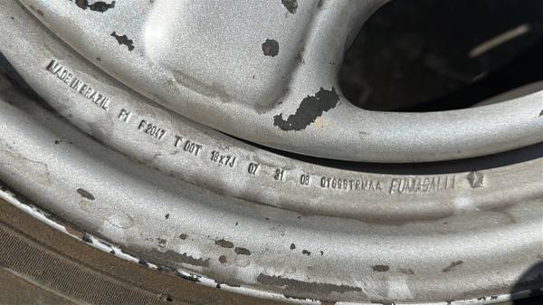 This is one original factory steel spare from a Dodge Dakota pickup truck or a Mitsubishi Raider pickup truck. It's a 16x7 inch factory steel wheel. It has the Chrysler Pentastar there on it, so it's an original factory wheel. The lug pattern is 5 on 5.5 inches, which is 139.7mm. It's not bent or cracked. There's no damage on it anywhere. Pretty much only fits on the Dakota or the Raiders with this lug pattern. The tire is old and should be replaced.