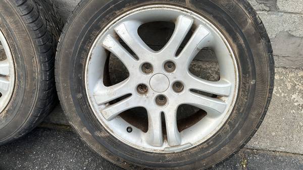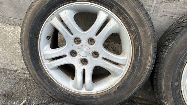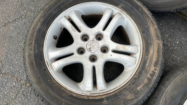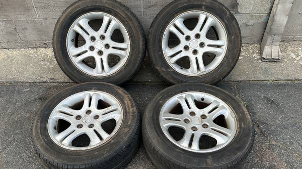 This is four 16x7 inch aluminum rims originally from a 1998 Dodge Intrepid car. The lug pattern is 5 on 115mm. They should fit on Chrysler 200 and Sebring cars as well as Dodge Avenger and caliber. They might also fit mopar minivans including caravan, town and country, or voyager. The rims are in good shape. They have a few dings and scratches, but they are not bent or cracked. The tires are old and need to be changed, but they are holding air.