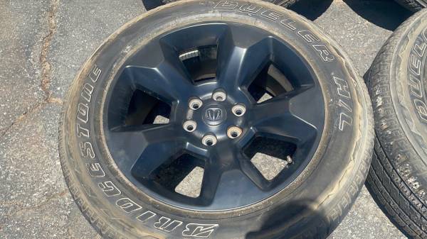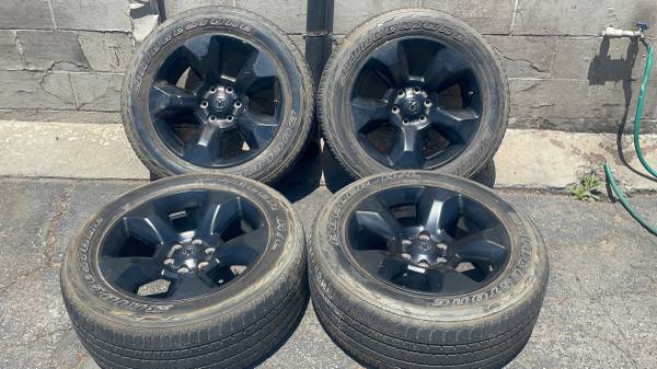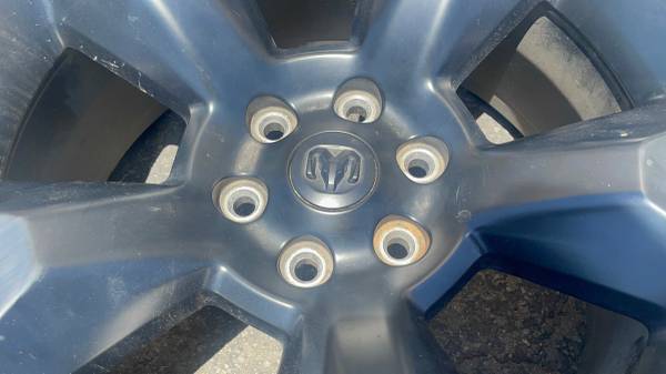 This is a set of four 20-inch black aluminum wheels, believed to be original factory black rims, from a 2019 or newer Dodge Ram pickup truck. The lug pattern is 6 on 5.5 inches, fitting new 6-lug Dodge trucks from 2019 and up. This pattern also fits most full-size 6-lug Chevy, GMC, or Cadillac trucks from the '90s and newer, including Silverado, Suburban, Tahoe, Avalanche, Sierra, and Yukon. All four rims are in good working condition with no bends, cracks, or big gouges. They have some small scratches but nothing that affects performance, and they still look pretty good. The tires are old and should be replaced, but they hold air for rollers/burners. These rims are perfect for any daily driver, project, or work truck.