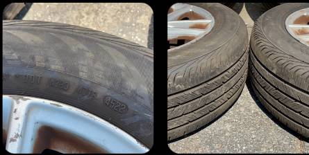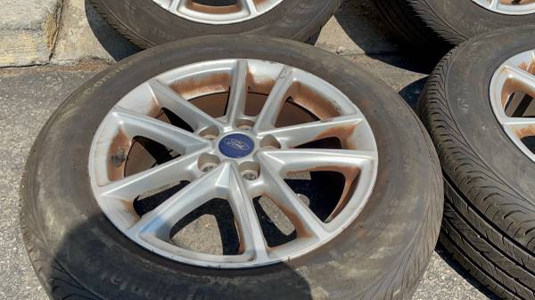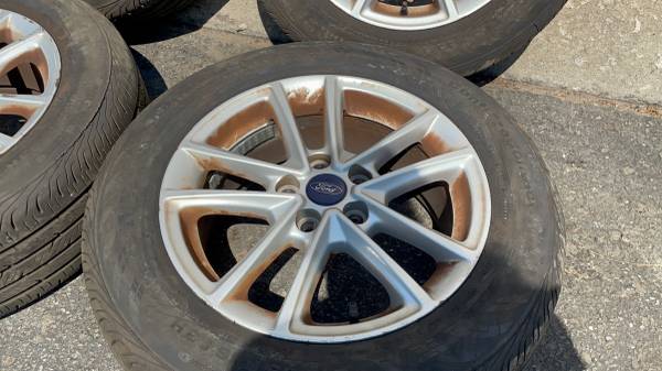 This is a set of four original 16-inch rims and tires from a 2015-2018 Ford Focus. The rims are in good working condition and the tires, with a 2022 DOT date, have more than half their tread remaining. The 5 on 108 millimeter lug pattern fits many small Ford vehicles, including the Taurus, Mercury Sable, and Lincoln LS. This set is a popular choice for the Ford Transit Connect and is ready to be mounted and put to work on your vehicle.