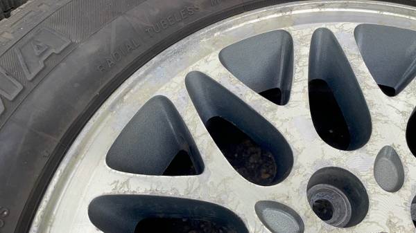 This is a set of four 15 inch factory "snowflake" style aluminum wheels from a 1990s Jeep Cherokee. The rims are in good working condition with no bends, cracks, or curb rash, but they are a mismatched set with three silver and one gold inlay. The 5 on 4.5 inch lug pattern fits Jeep Cherokee, Wrangler, and Comanche models, as well as Ford Rangers and some Toyota pickup trucks. The tires on all four wheels are not good and need to be replaced. This set is perfect for a daily driver, or for a project where you plan to paint or refinish them.
