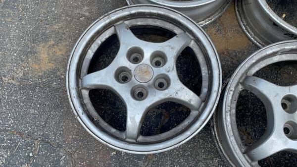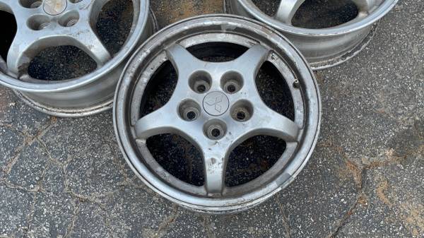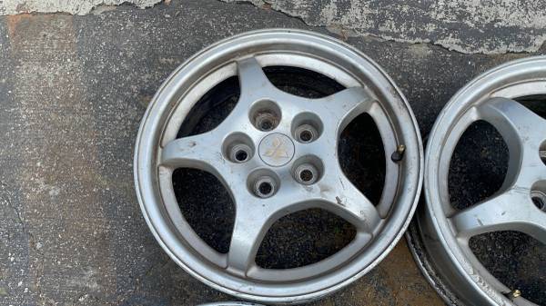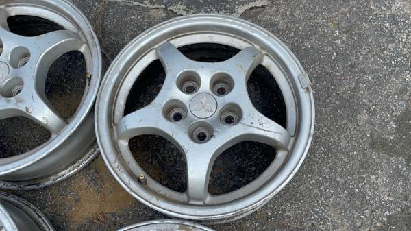 This is a set of four factory 16x6 inch aluminum wheels from a 1997-1999 Mitsubishi Eclipse. The bolt pattern is 5x4.5 inches (114.3mm), which fits most five-lug Mitsubishi cars and may also fit some Honda and Toyota vehicles. All four rims are in good structural condition with no bends or cracks, though they are a little dirty and have a few minor scratches that may be cleanable or polishable. No tires are included just rims and caps Perfect for any daily driver or project vehicle.