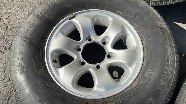 This is a set of four Aluminum 15 x 6 inch wheels originally from an 2001 through 2004 mitsubishi montero. The lug pattern is 6 on 5.5 inches which fits most classic 6 lug pickups and minitrucks including Chevy, GMC, Nissan, Datsun, and more. The rims are in good condition no bends or cracks. The tires are old and should be changed.