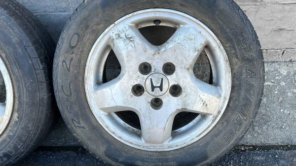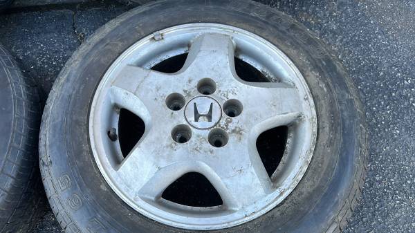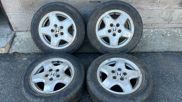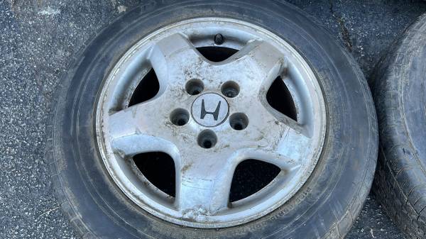 This is a set of four 15x6.5 inch aluminum wheels originally from a 2000 Honda Accord. The lug pattern is 5 on 4.5 inches which fits on most 5 lug Honda and Acura cars. The rims have some scratches but overall are in good condition. Perfect for a daily driver. The tires are old and should be changed.