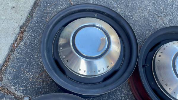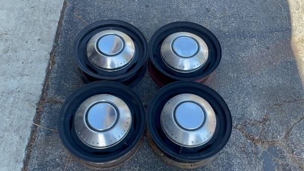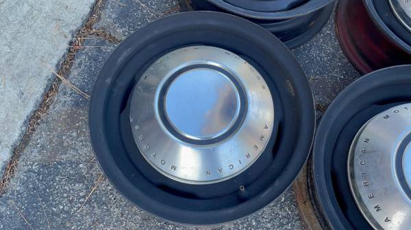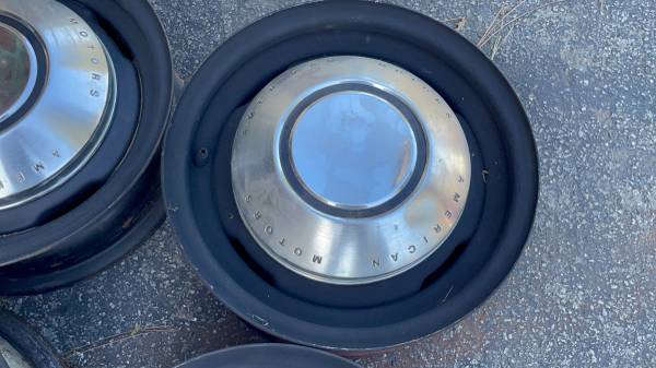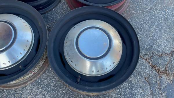 This is a set of four 14x5 inch stock steel wheels with dog dish hubcaps on them from an old AMC Rambler. the lug pattern is 5 on 4 .5 inches which is the same as a lot of Ford cars as well and a few others. So they should fit on a variety of classic Ford Lincoln Mercury, and some