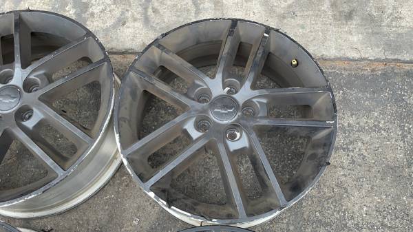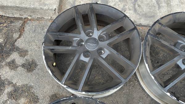 This is a set of four 18x7 inch factory aluminum wheels originally from an '08-'15 Chevy Impala. The lug pattern is 5 on 115 millimeters, which fits many Chevy and GM cars including Oldsmobile, Buick, Cadillac, and Pontiac. The rims are in good condition (black Plasti Dip peeling, could use repaint or removal), no bends, cracks, or major damage. Offset 52. Perfect for any daily driver, commuter, project.