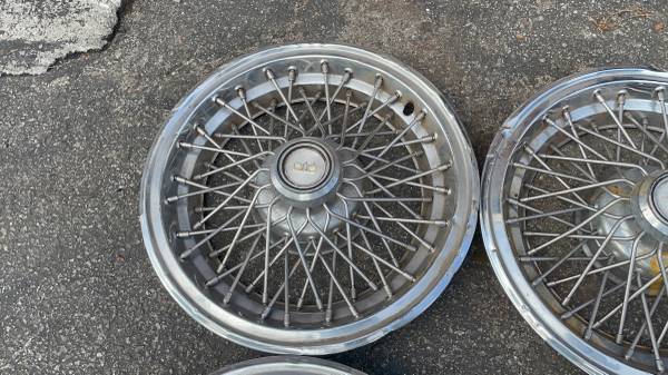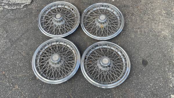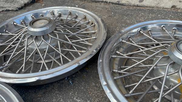This is a set of four 15-inch wire hubcaps that were originally equipped on a 1980s Chevy Caprice, fitting models from approximately 1983 to 1987. These hubcaps are designed to fit on any 15-inch stock steel wheel with a lip for hubcap mounting, making them compatible with various cars from the 1950s through newer models. The set is in good condition, with all four hubcaps coming complete with their center caps and having no missing or bent spokes. They show some little dings, scuffs, and scratches but are not badly bent and will securely stay on the wheel as they should. This set is perfect for any project or restoration, and they can be run on a daily driver in their present condition or easily refinished.
