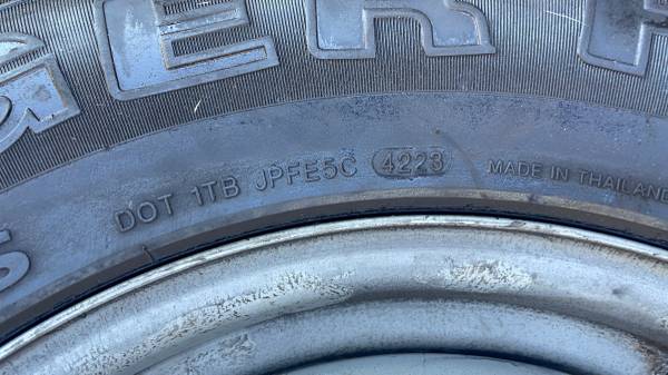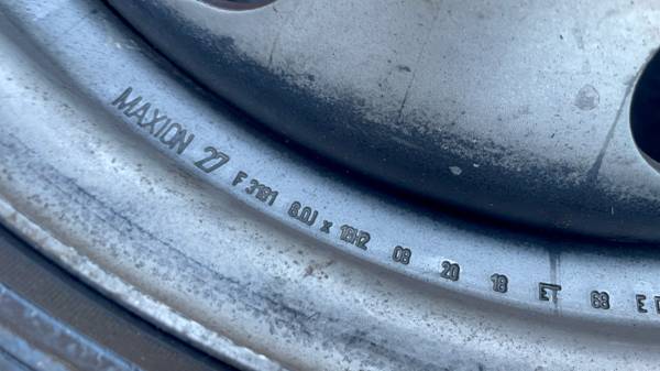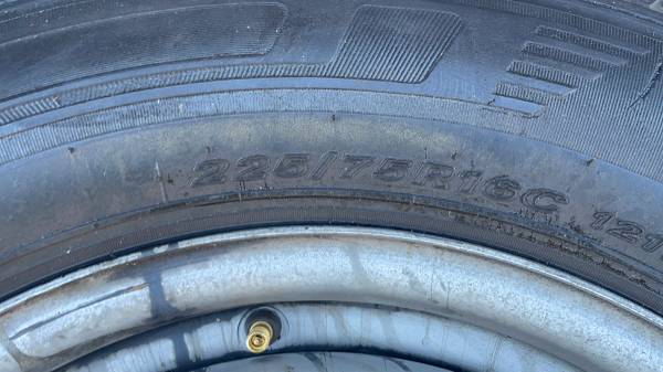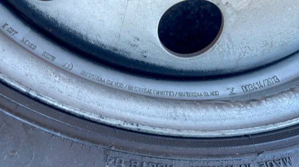 This is a set of four 16x6 inch original Mopar factory wheels from a Dodge ProMaster. All four steel rims are in good working condition with an ET68 offset and no bends or cracks, and they feature the authentic Mopar "M" stamp. The 225/75 R16 tires have a recent 2023 DOT date and approximately 15-20% tread left. The tires are suitable for temporary use, and the entire set of four wheels with tires is available for $300. This set will also fit some Sprinter vans and is ready to be put to work.