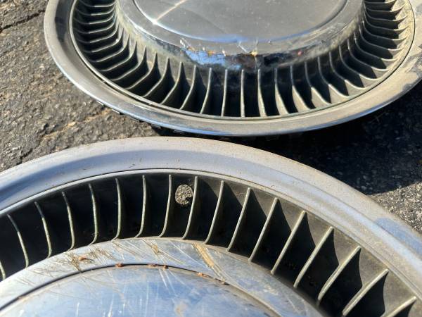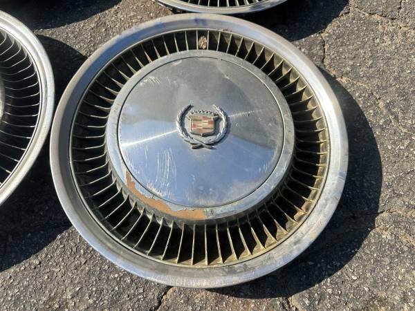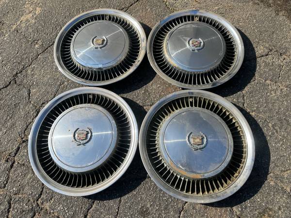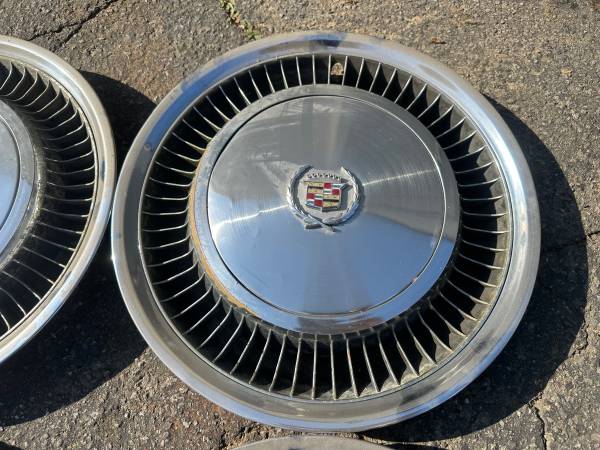 These is a set of four Stock hubcaps original from a 1976 Cadillac Classic. These four are all in slightly rough condition with either scratches or peeling on the chrome. They are not bent or cracked and will still work fine. I believe they would be original from 75-79, and I understand that with the fan blades around the outside they would be from a higher trim level car.