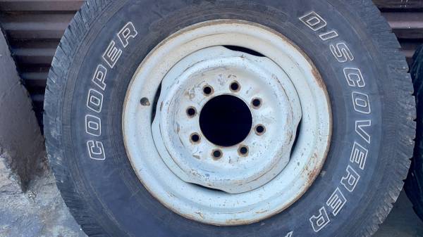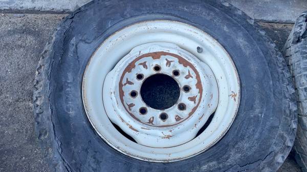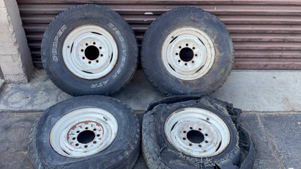 This is a set of four 16x6 inch original Ford stock steel wheels with original white paint from a 1990s F-250 pickup. The rims are in good working condition with minor scratches and surface rust, giving them a classic patina that also accepts dog dish style hubcaps. The 8 on 6.5 inch lug pattern and 4.5 inch center bore fits many classic Ford, Chevy, GMC, and Dodge eight-lug trucks and vans. They are compatible with Ford F-250/F-350 trucks, Chevy C20/K20s, and Dodge D200/D300s, among many others. The tires are not good and need to be changed, but this set is perfect for any daily driver, work truck, or classic build.