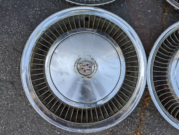 These are four Stock hubcaps original from a 1974 through 1975 Cadillac Classic. Good condition