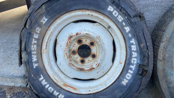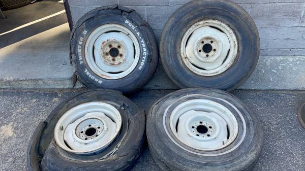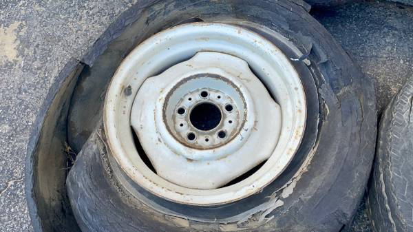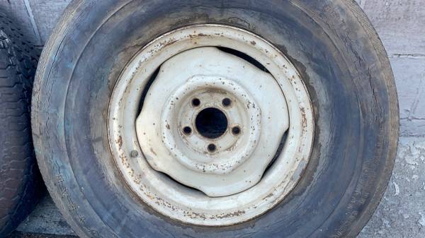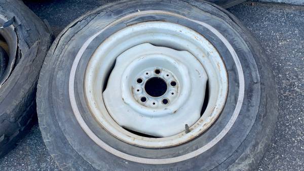 This is a set of four 15x6.5 inch stock steel wheels with original white Mopar paint, commonly found on old Dodge A100 vans. Although not a perfectly matching set from a single vehicle, all four rims are authentic Mopar, share the same size, and are in good working condition. The highly common 5 on 4.5 inch lug pattern fits a wide range of classic Mopar vehicles, including D-100 pickup trucks, A-100/B-100 vans, and many Charger/Challenger mid-size and full-size cars. The tires are very bad and must be replaced immediately. This set is perfect for any hot rod, rat rod, or restoration project requiring a durable steel wheel.