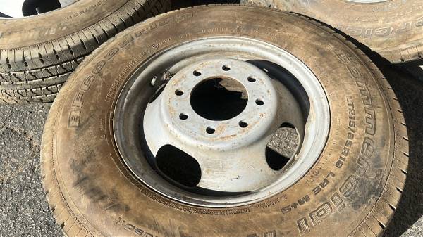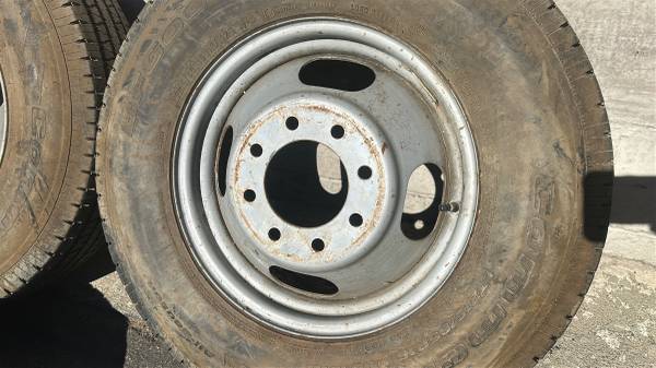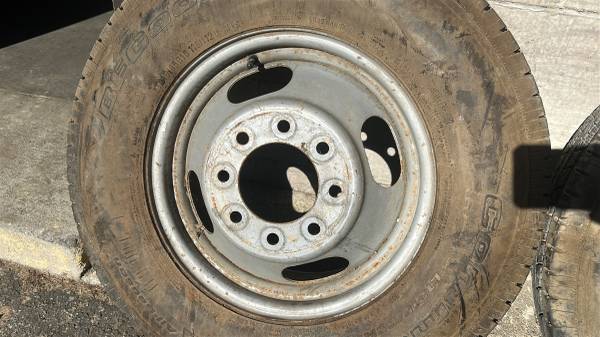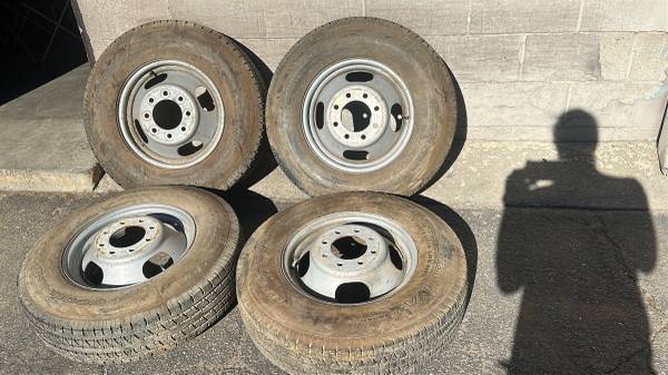 This is a matching set of four original factory steel dually wheels, measuring 16 by 6.5 inches, that came off a 3500 series Chevy or GMC Express box van. The wheels feature the heavy-duty 8 on 6.5 inch lug pattern and a GM-specific 4.5 inch center bore, ensuring a hub-centric fit on most Chevy and GMC dually trucks and vans from the 1990s or older. Compatibility includes C-30/K-30 Square Body trucks and older dual-rear-wheel models back to the 1950s, but they will not fit Ford or Dodge applications. All four rims are in good working condition, having no bends, cracks, or damage, and can be mounted on either the front or the rear of a dually. The tires are very old and should be replaced immediately, but they currently hold air for use as rollers to move a project vehicle.