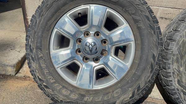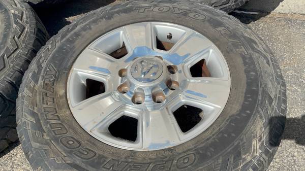 This is a set of four 18-inch original factory aluminum wheels from a 2014-2018 Dodge Ram Longhorn 2500 or 3500 series truck. All four rims are in good working condition with no bends, cracks, or major damage on them. The 8 on 6.5 inch lug pattern fits Ram trucks from 2014 or newer, but likely won't fit older generations due to the offset and center bore. The tires are all old and bad, so they need to be changed immediately. This set is perfect for a daily driver, a work truck, or a project vehicle.