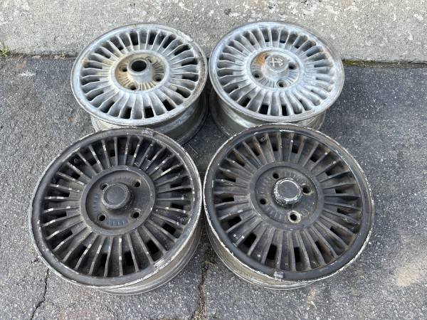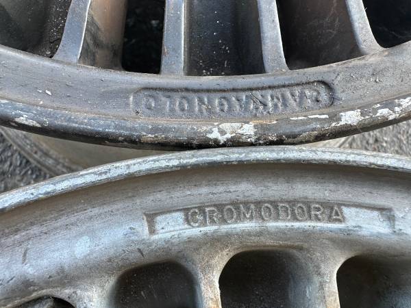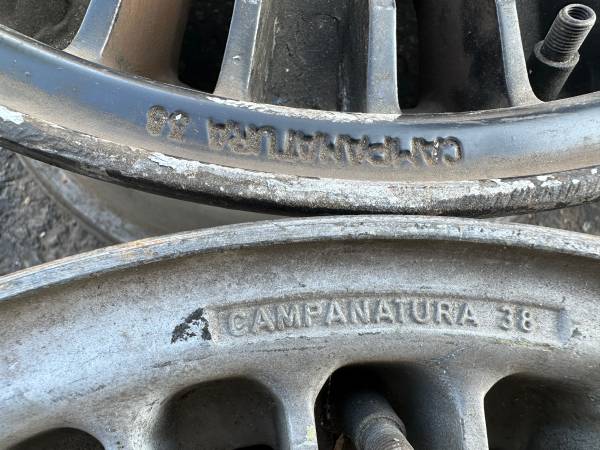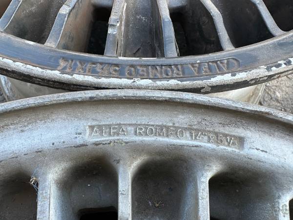 This is four 14x5.5 inch aluminum (possibly magnesium) wheels for a 1972 through 1994 Alpha Romeo Spider. They are in good condition with no bends, cracks, or visible damage. Two of them are painted black. They are not actually an original matching set; two of them are “cromodora” wheels and two of them are “campagnolo”. I’m not exactly sure what the difference is. All four are stamped “campanatura 38”. The lug pattern is 4 on 108 mm which fits on classic Alfa Romeo cars back to 1972 and maybe more.