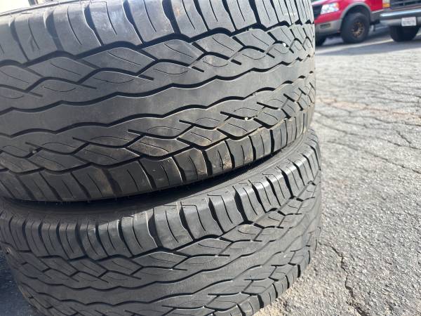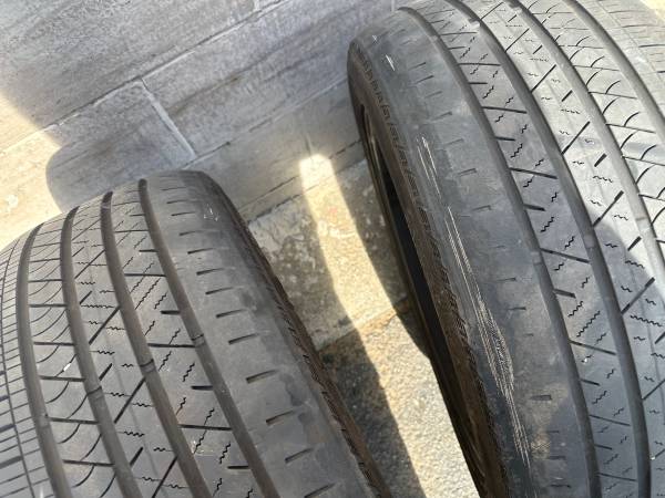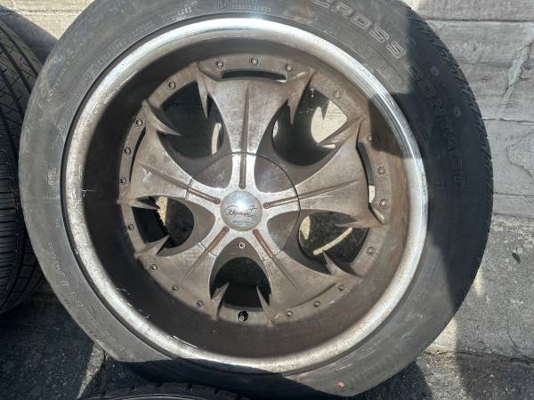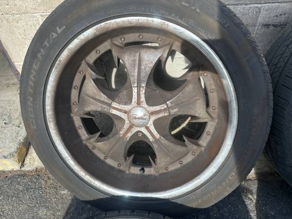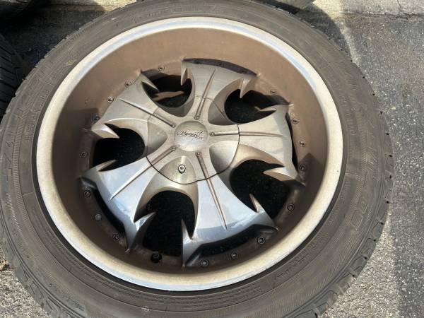The tires currently on the rims are 275/45r20 radials. Two of them are in good condition with more than half tread left. The other two have camber wear, and should be replaced. All four are currently holding air and working.