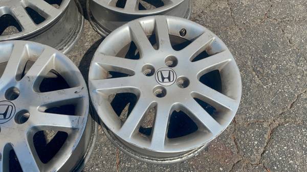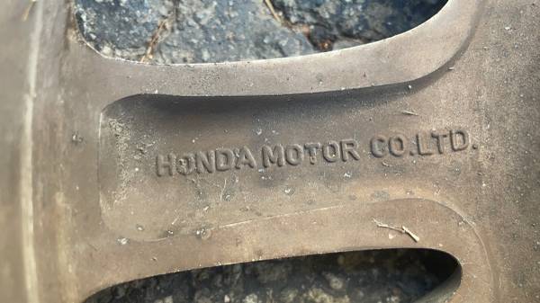 This is a set of four 15x6 inch original factory Honda aluminum wheels, likely from an '01-'03 Honda Civic Si. The 4 on 100 millimeter lug pattern fits most 4-lug Honda Civic cars, including Del Sol, and possibly Protégé and other small Hondas. All four rims are in good condition with minor scratches and dirt, but no bends, cracks, or major damage, making them perfect for any daily driver, project, or commuter.
