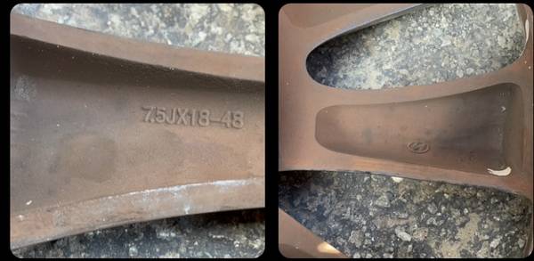 This is a set of four original factory Hyundai aluminum wheels, measuring 18 by 7.5 inches, that came off a 2011 through 2014 Sonata. The wheels feature the versatile 5 on 4.5 inch (or 5 on 114.3 millimeter) lug pattern, fitting most 5-lug Hyundai vehicles, along with many models from Toyota and Honda. All four rims are in good working condition, with a few scuffs but no bends, cracks, or major damage. Two rims have a matching pair of 225/45ZR18 Arroyo tires in very good condition with lots of life left. The other two tires are mismatched and older; one is usable for a while, but the other is balder and needs to be changed soon.