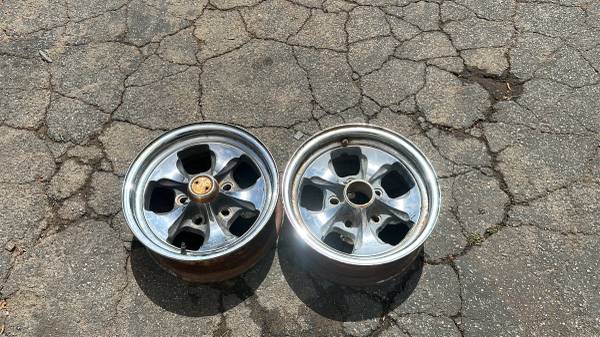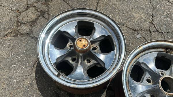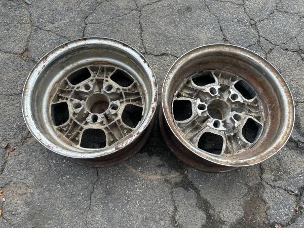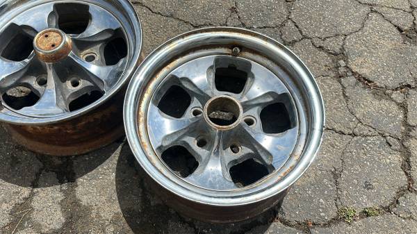 This is two 14x6 inch chrome keystone classic wheels in good working condition. They have some minor surface rust, but there's no bends or cracks. They still look good, and we actually clean up quite a bit The rims have the oblong lug holes They'll fit 5 on 4.5 5 on 4.75 or 5 on 5 lug vehicles Which is going to include almost all classic five lug vehicles. That's Chevy GM products including Cadillac Pontiac, Buick and Oldsmobile. It's Ford products including Lincoln and Mercury and it's Mopar products including Dodge, Chrysler and Plymouth. One of them has an old cap on it but it's missing the centerpiece. The other one has no cap on it but otherwise they're a matching set, well pair, they're two matching 14x6-inch Keystone classic chrome wheels. They have aluminum centers and steel barrels.