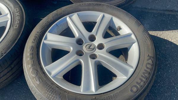 This is a set of four original factory aluminum wheels, measuring 17 by 7 inches, that came from a 2007 through 2009 Lexus ES 350. The wheels feature the versatile 5 on 4.5 inch (or 5 on 114.3 millimeter) lug pattern, which is the correct fitment for most 5-lug Lexus cars, along with many 5-lug Toyota models like the Camry, Solara, and possibly the RAV4. All four rims are in good working condition, showing no bends, cracks, or structural damage, though they are a little dirty and have a few minor scratches. The tires are old, worn out, and need to be replaced, as several are not holding air due to damage. This set of structurally sound Toyota-stamped rims is perfect for any project or commuter vehicle.